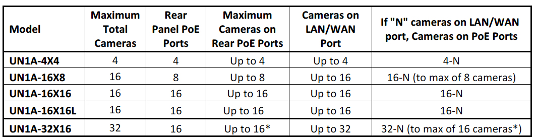 For the UN1A-4X4 and UN1A-16X16XL, that is rather straightforward. Cameras can be connected as Plug-and- Play to the PnP ports. Cameras can be connected as “manual” configured cameras through either the PnP ports or the LAN/WAN network port. Either way, on these two models, the maximum number of connected cameras is exactly equal to the number of PnP ports on the rear panel. If any camera is connected via the LAN/WAN network port, that is one less camera that can be connected to one of the PnP ports.