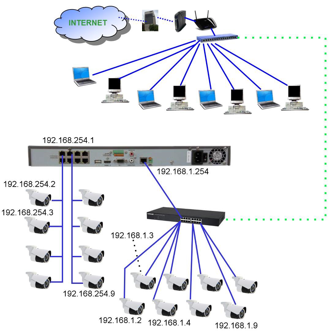 One simple way to connect two networks with different network numbering schemes is a router. A simple home/office router will likely suffice. The “LAN” side of the router connects to the auxiliary camera network switch. The router LAN port is assigned a compatible IP address (e.g. 192.168.1.253). The “WAN” side of the router is connected to the home/office LAN/WAN and is assigned a static IP address compatible with that network (e.g. 192.168.0.50). Since routers function as DHCP hosts, to avoid conflicts the DHCP function in the additional router should either be disabled, or restricted to a very limited address range, e.g. 192.168.1.245~ 192.168.1.252. This DHCP capability aids in the connection of wired or wireless PCs and other devices to that NVR/camera network for monitoring and diagnostic purposes.