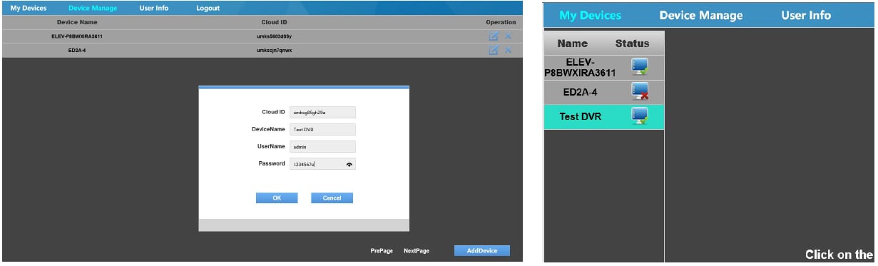 Enter in your CLOUD ID, the Device Name (any nickname you prefer), and then the User Name and Password of the DVR/NVR
