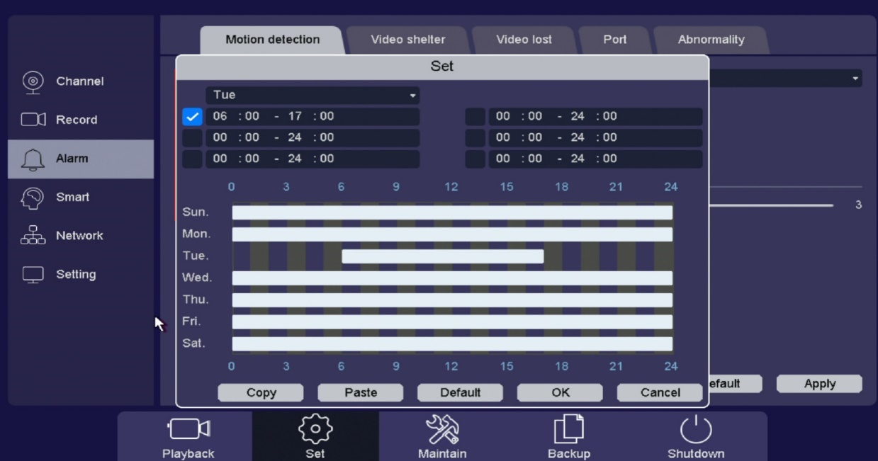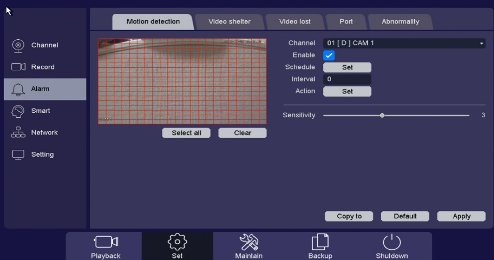 Click the “Mail Test” button to make sure you get a successful connection. If not, refer to Gmail account and make sure Less Secure Apps is turned On and all information is entered correctly. Once you get a success message Click “Apply” to save. Enabling Motion Detection Emails