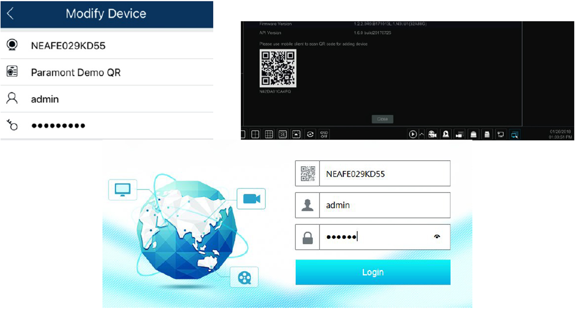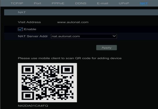 Login using QR number, which can be found in your mobile app (once scanned), the NAT menu or the Information Menu (first button to the left of your date/time). Then the DVR/NVRs user name and password (by default: admin/123456)